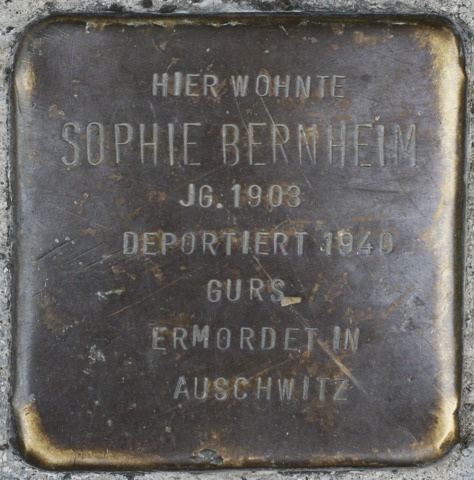 Sophie Bernheim wurde am 18. September 1903 in Müllheim geboren. Sie war Hausgehilfin und lebte in Emmendingen. Vom 19. Oktober 1936 bis zum 25. Februar 1937 wohnte sie in der Theodor-Ludwig-Str. 8. Sie kehrte nach Müllheim zurück und lebte anschließend ab dem 6. März 1937 bis zum 15. Juli 1937 wieder in der Theodor-Ludwig-Str. 8 bei Jakob Wendel. Vom 15. Juli 1937 bis 15. April 1939 wohnte sie in der Karl-Friedrich-Str. 17 (bei Metzgermeister Leopold Goldschmidt). Als Sofie Bernheim in Emmendingen keine Arbeit mehr als Hausgehilfin fand, ging sie ins jüdische Friedrichsheim nach Gailingen. Bei dieser Einrichtung handelte es sich um ein jüdisches Altersheim, auch "Landesasyl" genannt. Dort lebte sie ab dem 15. April 1939. Am 22. Oktober 1940 wurde sie aus Konstanz nach Gurs deportiert. Das Durchgangslager war Drancy, das Deportationsdatum der 10. August 1942, RSHA-Transport 17. Der 12. August 1942 ist das Todesdatum vom Sophie Bernheim, als der RSHA-Transport 17 in Auschwitz-Birkenau ankam.