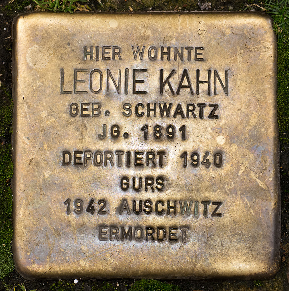 Am 22. Oktober 1940 wurden Sigmund und Leonie Kahn ins südfranzösische Internierungslager Gurs deportiert. Sigmund starb dort wenige Wochen später am 1. Dezember 1940. Leonie überlebte im Lager Gurs zwei Jahre, wurde aber am 16. September 1942 nach Auschwitz deportiert. Dort verliert sich jede Spur. Am 8. Mai 1945 wurde sie für tot erklärt.