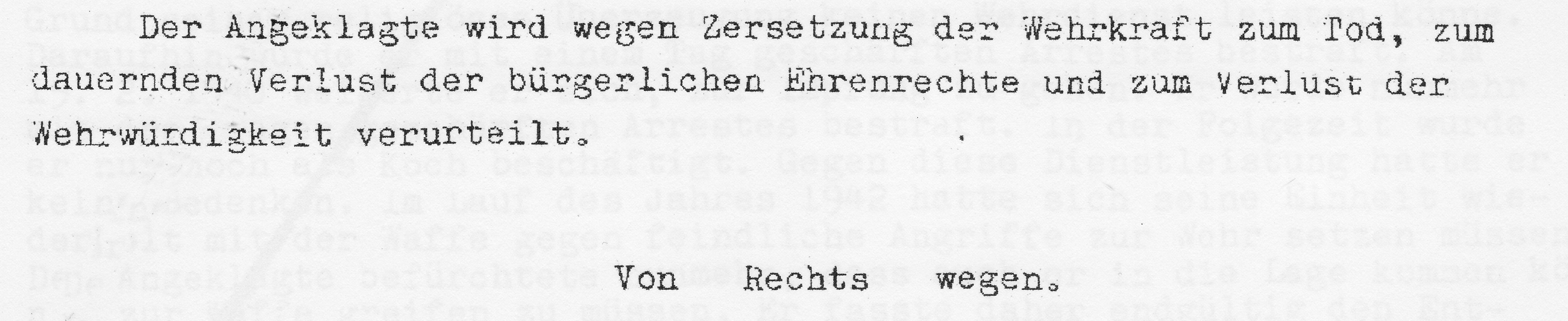 Am 19.September 1942 steht er vor dem 3. Senat des Reichskriegsgerichtes und wird zum Tode verurteilt.