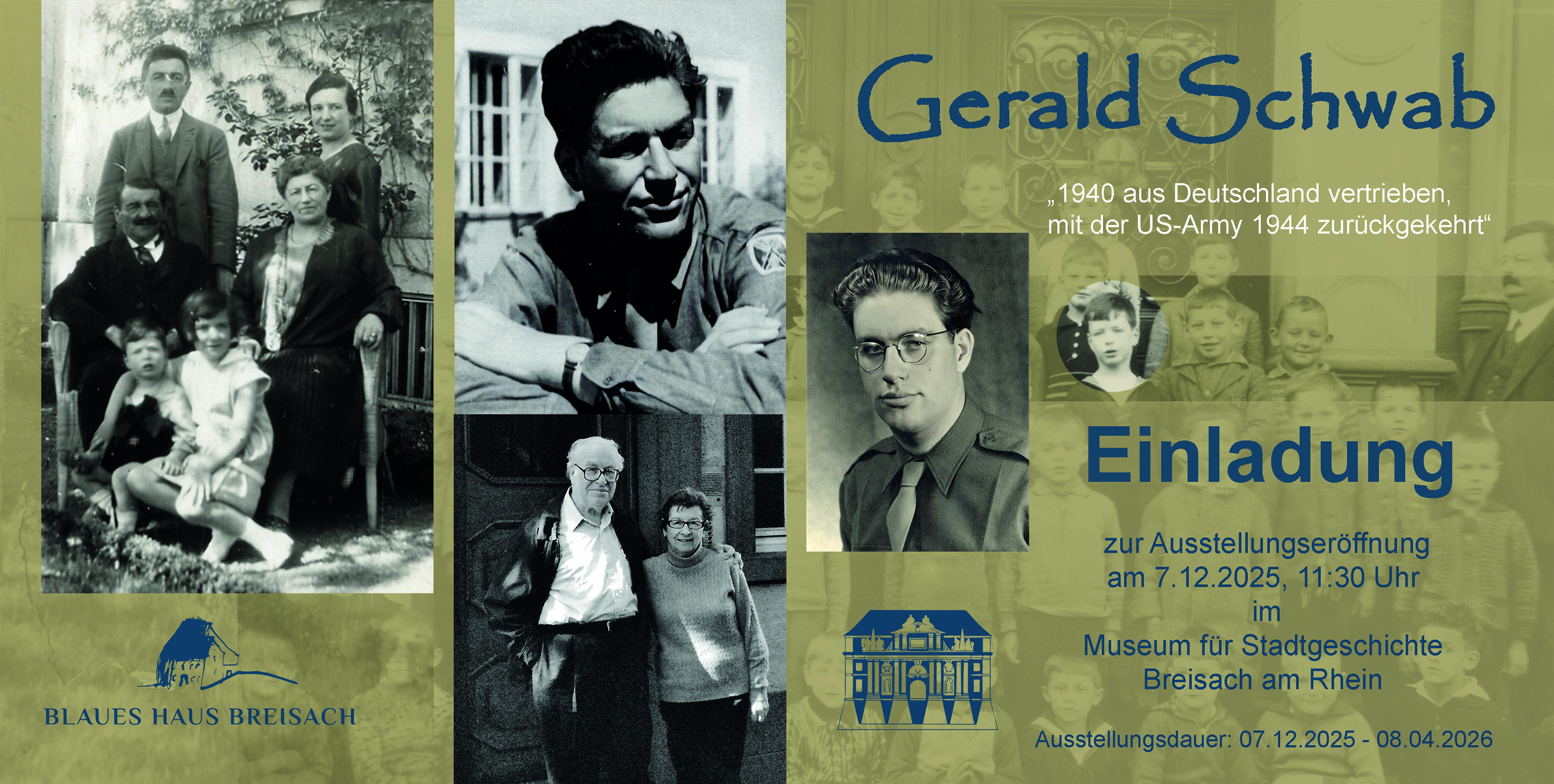 Unsere Mitglieds-Gedenkstätte, das "Blaue Haus" in Breisach, lädt zur gemeinsamen Ausstellung des Museums für Stadtgeschichte Breisach und des Blauen Hauses ein. Diese widmet sich Gerald Schwab, der vor 100 Jahren als Gerhard Abraham Schwab in Freiburg geboren wurde. Seine familiären Wurzeln führen nach Breisach, wo seine Mutter Paula Kleefeld und sein Vater David Schwab geboren wurden und aufgewachsen sind. Der Familie gelang die Flucht in die USA. Von dort kehrte Gerald Schwab 1945 zurück nach Deutschland, um mit der US-Army für die Befreiung Europas von den Nationalsozialisten zu kämpfen. Als nur 20Jähriger wurde er Übersetzer bei den Nürnberger Prozessen bevor er ein Universitätsstudium antrat und später im diplomatischen Dienst der USA stand. In den Jahren 1945 und 1946 besuchte er die Heimatstadt seiner Eltern und dokumentierte die Zerstörung Breisachs. Die Ausstellung im Museum für Stadtgeschichte Breisach zeigt seine eindrucksvollen Fotografien und widmet sich ebenso den familiären Wurzeln und dem Leben Gerald Schwabs. Das Team des Blauen Hauses ist dankbar, dass Gerald Schwab ihm Fotos und Dokumente anvertraut hat, die er auch mit dem United States Holocaust Memorial Museum in Washington DC geteilt hat. Seit 2003 unterstützte er die Bemühungen, das Blaue Haus zu einer Gedenk- und Bildungsstätte aufzubauen. Einladungsflyer: