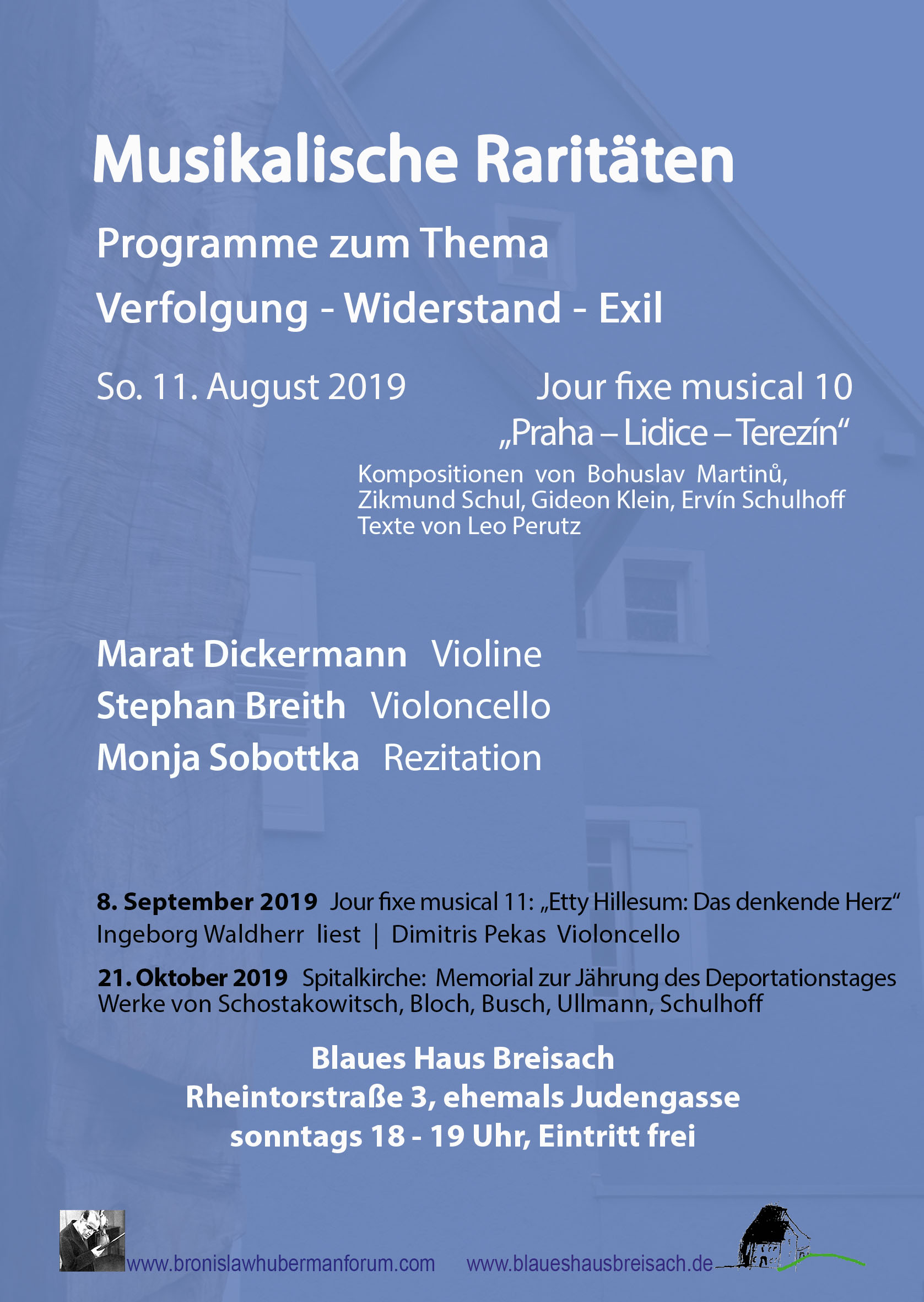 Unter dem Motto: „Musikalische Raritäten zum Thema Verfolgung – Widerstand – Exil“ hat im September 2018 im Blauen Haus Breisach die Reihe „Jour fixe musical“ begonnen, bei der in erster Linie von den Nazis verfemte Komponisten und Interpreten zu Worte kommen. Die Programmfolgen widmen sich aber ebenso Werken von Komponisten, die Widerstand geleistet haben oder von Künstlern, die in anderem geschichtlichen Zusammenhang verfolgt wurden oder ins Exil gehen mussten: Festival Pro 4: Prag – Lidice – Terezín Marat Dickermann Violine | Stephan Breith Violoncello Monja Sobottka Lesung Bohuslav Martinu, >Lidice< – Film des Orchesterwerks Ervín Schulhoff, Duo für Violine und Violoncello Leo Perutz, Zwei Kapitel aus >Nachts unter der steinernen Brücke< Zikmund Schul, Chassidische Tänze Opus 15 Gideon Klein, Duo für Violine und Violoncello (sowie vom Tonband: Karel Ančerl dirigiert) Weitere Veranstaltungen in dieser Reihe: Veranstaltungsübersicht Breisach 2019-20Sonntag, 11. August 2019, 18 Uhr Breisach, Blaues Haus Eintritt frei