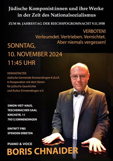 Jüdische Komponist:innen und ihre Werke in der Zeit des Nationalsozialismus - VERBOTEN! Verleumdet. Vertrieben. Vernichtet. Aber niemals vergessen! Veranstaltung zum 86. Jahrestag der Reichspogromnacht 09.11.1938 Musikalisches Programm mit Boris Chnaider (Piano & Voce) Veranstaltungsplakat:Sonntag, 10. November 2024 11:45 Uhr Simon-Veit-Haus, Teschemacher-Saal Kirchstr. 11, 79312 Emmendingen Eintritt frei - Spenden erbeten